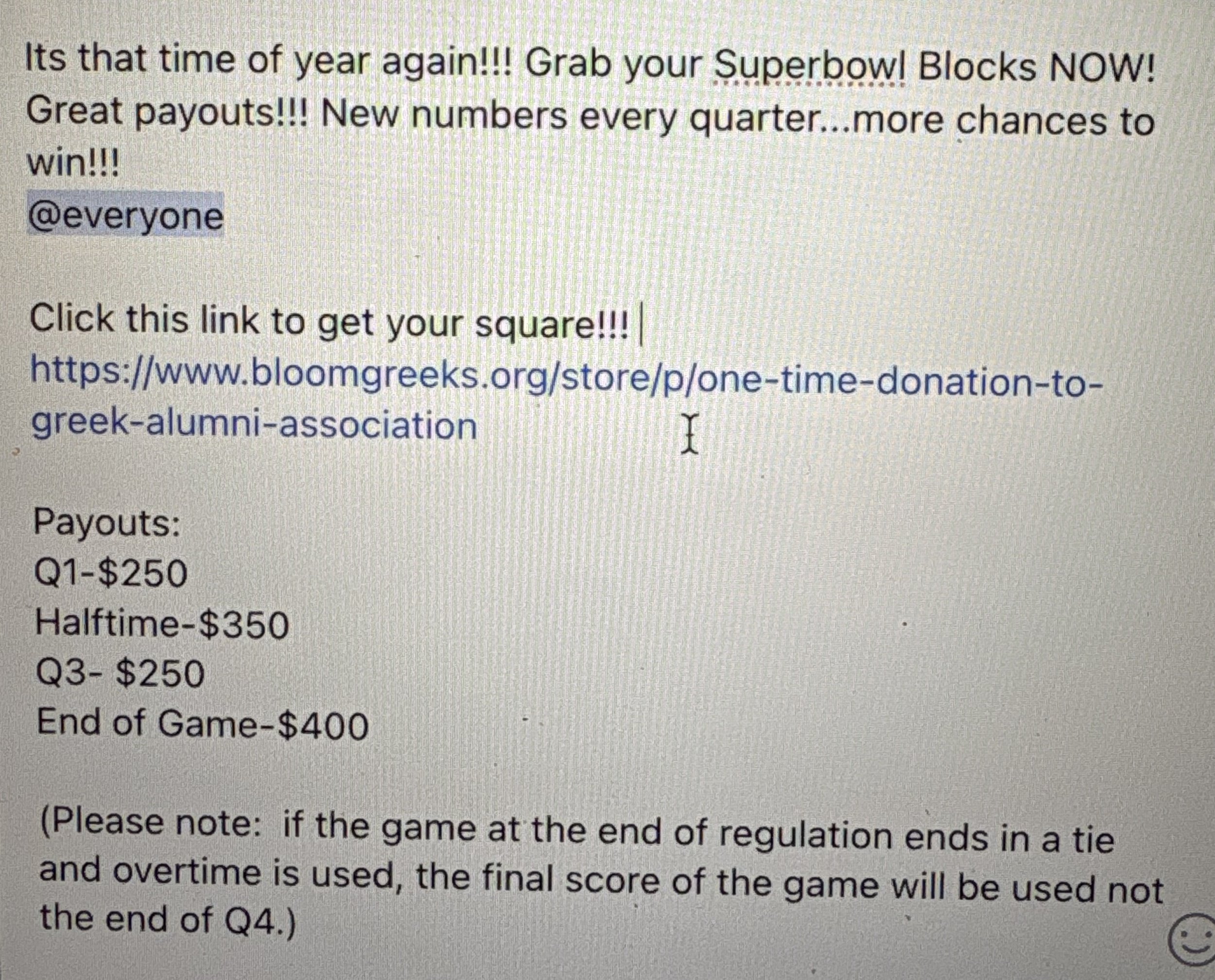 Super Bowl Block Pool for Bloomsburg Greek Alumni Association!